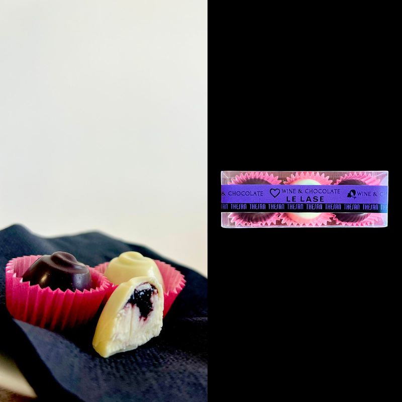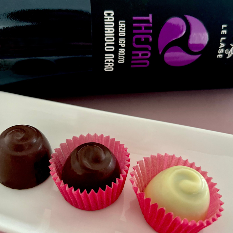 Praline di cioccolato fondente o bianco con cuore di Vino rosso Thesan Canaiolo Nero Lazio IGP.